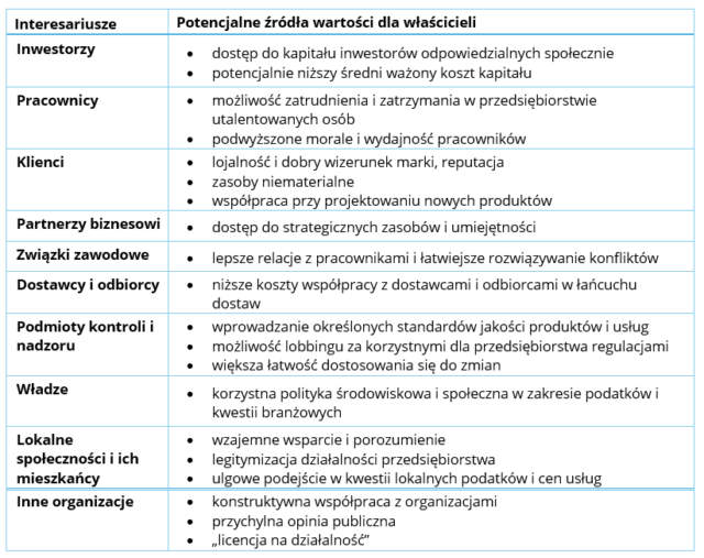 Tworzenie wartości dla interesariuszy (stakeholders) jest jednak utrudnione, bo w przeciwieństwie do akcjonariuszy (shareholders), zainteresowanych przede wszystkim osiąganiem dochodów z działalności spółki, interesariusze to grupa posiadająca zróżnicowane oczekiwania, zasoby i bardziej obszerna zakresowo, obejmująca m.in. pracowników, klientów, dostawców, kredytodawców, a w szerszym kontekście społeczeństwo lokalne.