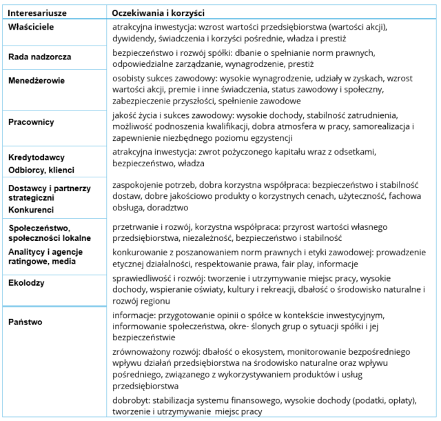 Tabela 3.1. Przykładowe oczekiwania i korzyści interesariuszy w odniesieniu do przedsiębiorstwa